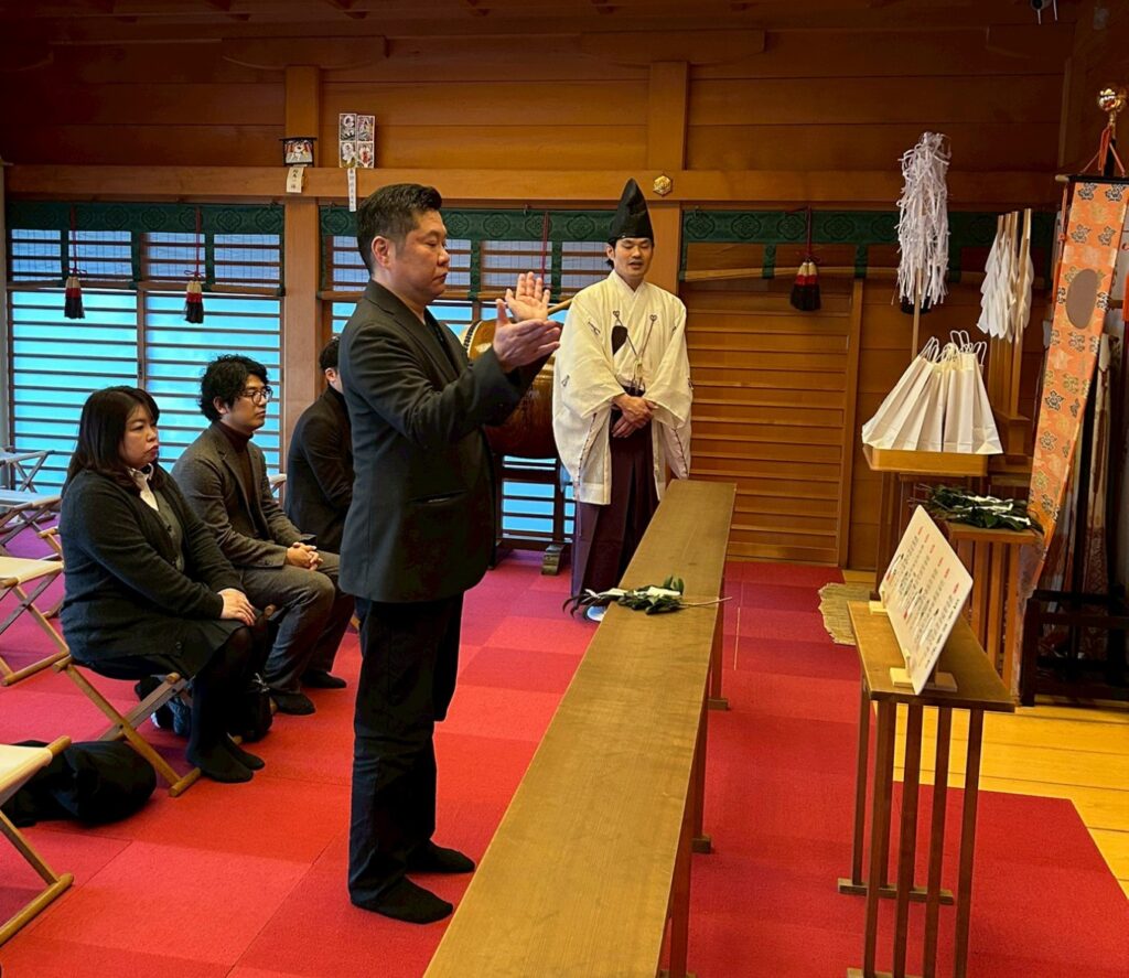 拝殿に昇殿し、祝詞が奏上される厳かな時間。役員一人ひとりが、グループの歩みや現場で働く社員の姿を思い浮かべながら、静かに祈りを捧げました。
