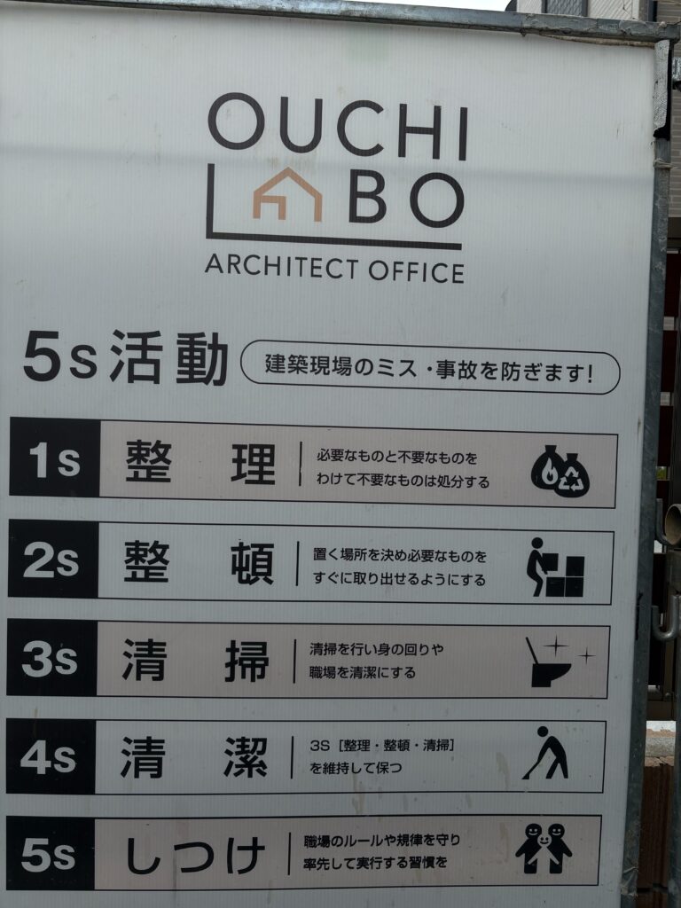まず目に入ったのは、当社ロゴ入りの養生シートと、建築現場に掲示された5S徹底宣言でした。