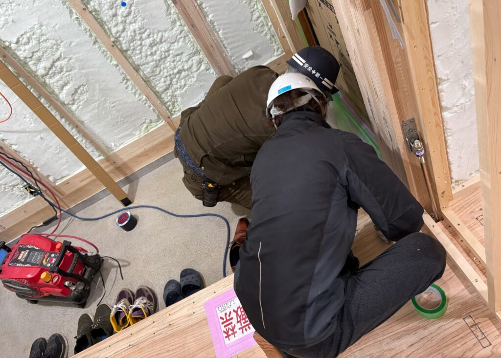 小林部長(奥)は現場の方と養生テープで気密測定の準備