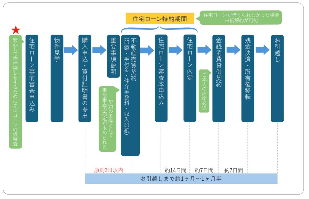 住宅購入では、まず安心して物件探しを行うために住宅ローンの事前審査を行います。物件が決まると購入申込みを行い、重要事項説明・売買契約へと進みます。契約後は住宅ローンの本審査を申込み、審査承認後にローン契約(金銭消費貸借契約)を締結します。その後、残金決済と所有権移転を行い、無事お引渡しとなります。住宅ローン特約期間内に融資が承認されない場合は、白紙解約が可能な点も重要なポイントです。全体でお引渡しまで約1〜1.5ヶ月が目安となります。
