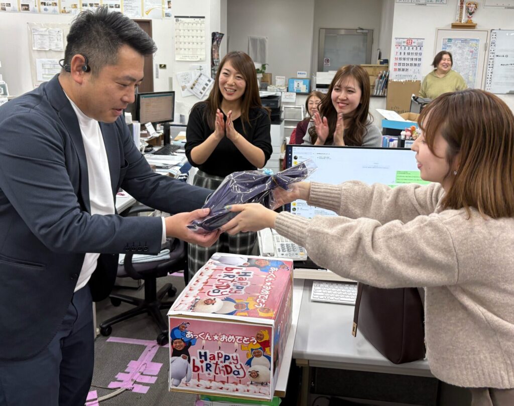 年末の慌ただしさが増すこの時期、新所沢のオフィスには、いつもとは少し違う、あたたかくて弾むような空気が流れていました。その理由は、あるベテラン社員の誕生日。