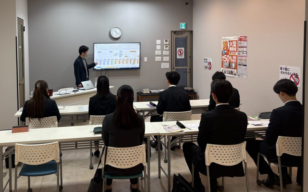 まず鈴木専務からは、会社概要や組織についての説明が行われました。グループ全体の構造や各社の役割、事業のつながりについて具体的に語られ、新入社員にとっては「自分がどの組織の中で働くのか」を理解する貴重な時間となりました。