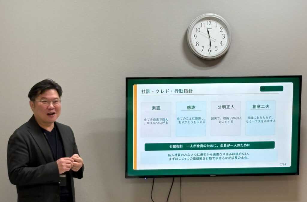 この“理解”と“一体感”は、今後の成長において非常に重要な要素です。知識だけでなく、感情や意識の部分まで共有できたことが、この研修初日の大きな成果と言えるでしょう。